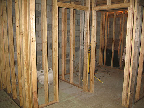 4-24-2020 This is another photo of these new wall studs. To the left is going to be one of the half baths, and to the right is an eight foot by eight foot room that could be used for various things. It could be used for storage, or if someone ever gets the great hall finished to the point that it could be used for weddings, this could be used for the bride to get ready for the wedding.